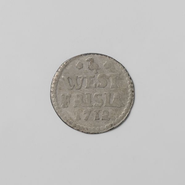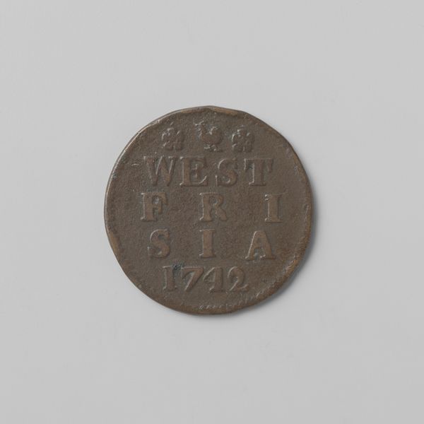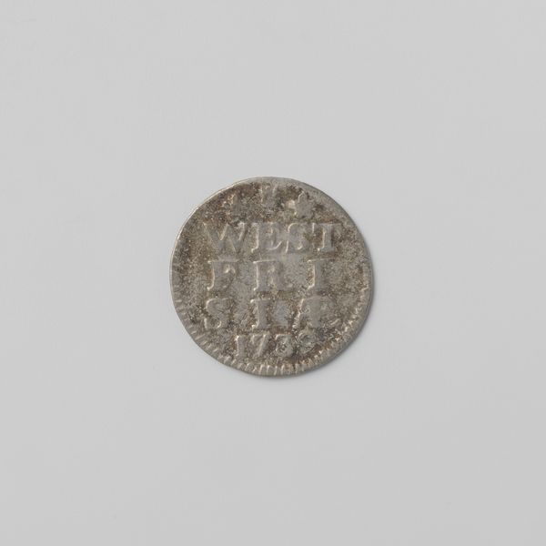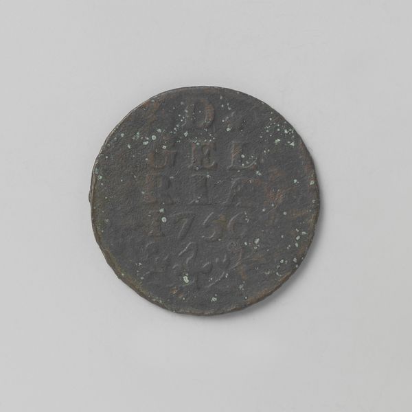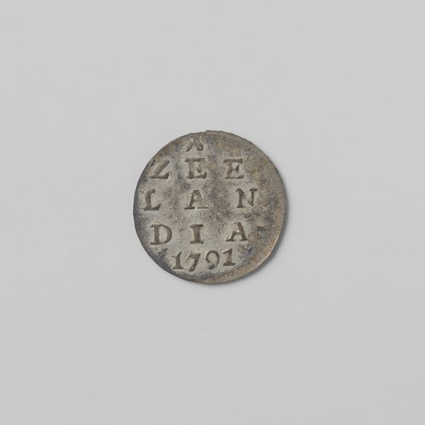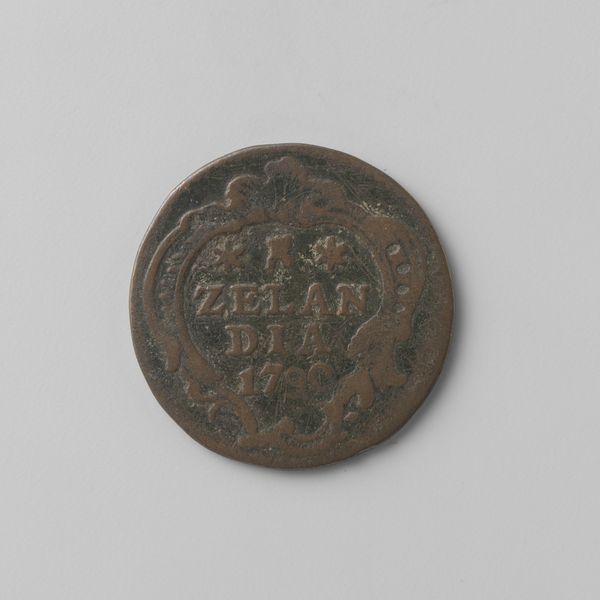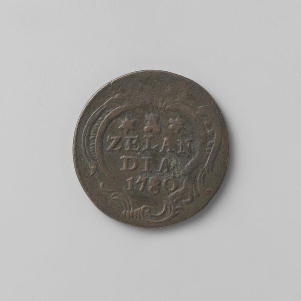 Curator: Here we have a Zeeuwse duit, dated 1793, issued by the Province of Zeeland. These small copper coins circulated during a turbulent time. Editor: My first impression is the object’s texture. Despite its simple design, the surface seems deeply tactile. The raised lettering and border give it a kind of graphic elegance. Curator: Absolutely. Consider the context: The Dutch Republic was on the brink of revolution, mirroring the unrest in France. This little coin was part of a much larger drama. Issuing its own coinage was one way for Zeeland to exert its authority, its very identity, even as the old order crumbled. Editor: It’s striking how the arrangement of the letters—Z, L, D—forms a central block, flanked by those three somewhat ambiguous star shapes. The organization gives this tiny token such a remarkable visual weight. Curator: Indeed, currency always tells a story about who holds power, whose image is sanctioned for circulation. But the story here isn’t of grand portraits but of practical governance at a local level. The symbolism might seem sparse, yet that abbreviation “Zeelandia,” is very impactful, in affirming the province's agency through commerce. Editor: I see that dotted rim functioning like a frame—clearly separating the coin’s “inner world” from its surrounding environment. And the muted tones make it feel as if it’s a study in restraint and understated authority. Curator: Precisely. Even small, mundane objects like this help us reconstruct a world of political contention, where power was negotiated at every level of society, and yes, visually expressed through material. Editor: Looking closer at the material properties really does give one a palpable sense of the past. A coin is so easily passed between hands, between places… So to grasp this coin today is to hold a small material portal to the late eighteenth century. Curator: Exactly. Editor: Thank you.