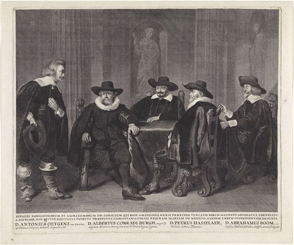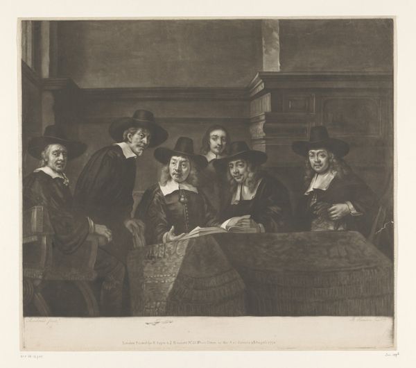 Curator: This print, dating from about 1846 to 1847, offers a fascinating glimpse into the world of civic governance. It’s entitled "De Staalmeesters", rendered by Henricus Wilhelmus Couwenberg after an original by Rembrandt. It captures a genre scene within the sphere of Dutch Golden Age painting and portraiture. Editor: The subdued, almost monochromatic tones of the engraving immediately give me a feeling of seriousness and gravitas. There’s a real weightiness in their gaze and attire; it seems symbolic of responsibility and authority. Curator: Absolutely. "De Staalmeesters"—"The Sampling Officials"—were responsible for assessing the quality of cloth produced in Amsterdam. Couwenberg's print invites us to consider the socio-economic structures of 17th-century Holland and their meticulous oversight. Editor: Those sober, dark clothes serve not just to distinguish them by rank, but to make them a solid group: sober, dependable. I notice the hands – those that hold papers, and those simply resting. It suggests something of their characters. They are united by this table, by a profession and perhaps some unspoken code. Curator: The symbolism is also interwoven within the context of Dutch art during this period. Group portraits were a visual way to depict civic unity and the shared values of the burgeoning merchant class. Couwenberg's rendering connects to both historical and contemporary aspirations toward representing these key societal pillars. Editor: Beyond the immediate setting, do you think Couwenberg was tapping into a more archetypal imagery here? The authority, the record-keeping—these are themes that resonate throughout cultures and histories, in many sorts of imagery. Curator: I think he understood how to capture a feeling of history and continuity, drawing on academic traditions to give resonance to the theme, using his print to emphasize enduring institutional power, long after the original “Masters” would pass away. Editor: Seeing how Couwenberg brings the subject matter from painting to engraving, and then considers those universal human themes, reminds you that art serves to transmit values as much as reflect them. Curator: A fitting observation to carry as we proceed onward, acknowledging the past even while stepping into what comes next.