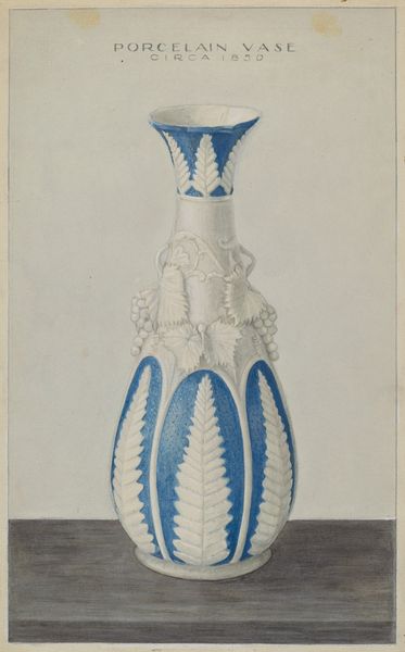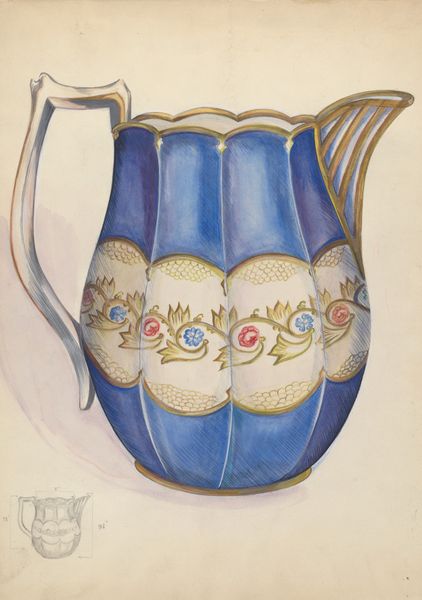 Editor: This is a watercolor and colored pencil drawing called "Pitcher," created around 1936. It looks like a design for a very fancy, perhaps antique, water pitcher. The classical figures on either side almost seem like they’re trapped within these blue archways. What stands out to you in this piece? Curator: The immediate impression is of something historical being filtered through a modern sensibility. Look at the choice of rendering the design for a functional object – a pitcher. How might the historical context, particularly the economic pressures of the 1930s, influence an artist to focus on reimagining utilitarian objects with such decorative complexity? Editor: That’s interesting – it could be seen as aspirational during a difficult period. But who would have seen this drawing? Curator: That’s the crucial question. Was this intended for mass production, a one-off commission, or simply an exercise in artistic design? Understanding its intended audience shapes our understanding of its cultural function. Were these designs to reinforce social hierarchies, or introduce an aesthetic into more modest homes? Editor: So the intention behind it would have shaped the political purpose of the art, right? Curator: Precisely. Consider also how the “front view” inscription dictates our perspective. How does knowing this is merely a single facet alter our engagement with it as an object of design? Is it selling function, aspiration, or perhaps something else entirely? Editor: I hadn’t considered how much the 'front view' designation affects how we see it. It almost feels incomplete. Curator: Exactly. By thinking about the design's potential for production, the intended audience, and the single perspective offered, we reveal its possible socio-cultural narratives. Editor: This has given me a completely new angle to approach design with, and it makes me realize there is a whole other world that is influencing the final work. Curator: And that broader historical context, is after all, part of what informs it, both yesterday and today.
