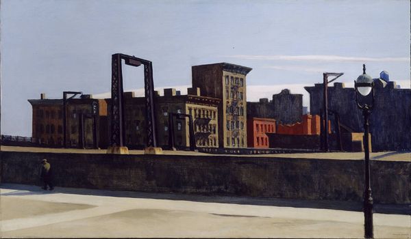 Editor: This is "Waterfront Mill," an oil painting by Niles Spencer, completed in 1940. It's quite striking how geometric and simplified everything is. What stands out to you most in its composition? Curator: I observe the emphasis on flattened planes and simplified forms. Consider the interplay of rectangular shapes: the buildings, windows, and the suggestion of a steel framework. This adherence to geometric structures provides an underlying sense of order. How does the color palette inform this reading, would you say? Editor: It seems subdued, almost muted, with browns and grays dominating, except for the strong red block in the front. Does that deliberate use of color, or lack thereof, serve a purpose in your eyes? Curator: Indeed. The restricted palette directs our attention to the underlying structure. Color, or the near absence of it, serves to highlight form. The contrast between the red building and the overcast sky reinforces the architectural forms. It allows the eye to focus on spatial relationships between objects. Notice also how the composition seems balanced. The strong verticals—the buildings and smokestack—create a rhythm that’s subtly disrupted by the angled lines of the steel framework. It creates an interesting tension, wouldn’t you agree? Editor: Absolutely. The contrast draws my eye into that part of the painting. Thanks, I'm appreciating how those small elements contribute to the overall impression so much more now! Curator: My pleasure. The reductive clarity and the geometric framework invite the viewer to consider the relationships between structure, space and color as the ultimate subject. It’s in this orchestration of these fundamentals where, I believe, we find the heart of the artwork.