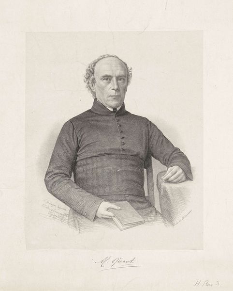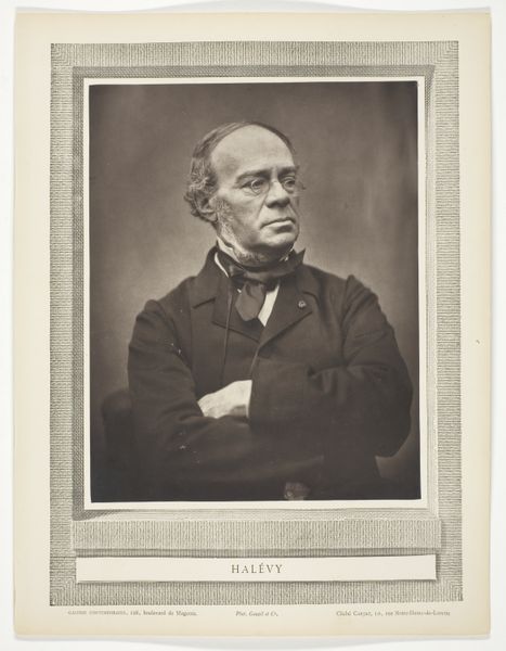 Curator: Let's discuss this print by Etienne Carjat, a portrait of Jacques-Fromental-Elie Halevy. Editor: It's incredibly striking, the sepia tones lending a somber, almost melancholic air. Curator: The tonal range is definitely key. The artist's use of light and shadow models Halevy’s face, highlighting his intense gaze and the lines etched by time. Editor: And consider the production method. Carjat was a master of wet collodion. Think about the craft involved—coating, sensitizing, exposing, developing—a tangible record of labor. Curator: Indeed. But the result is not just a technical feat; the formal composition guides our eye through a network of subtle triangles, lending a sense of stability and intellectual authority to Halevy's presence. Editor: Yes, a stability born from very specific material conditions and choices made in the darkroom. Makes you consider how "truth" is manufactured in photographic portraits, doesn't it? Curator: Precisely, prompting a deeper reading of the relationship between image, subject, and viewer. Editor: A point well taken. I've gained a new appreciation for the craft and cultural implications at play in Carjat's image.