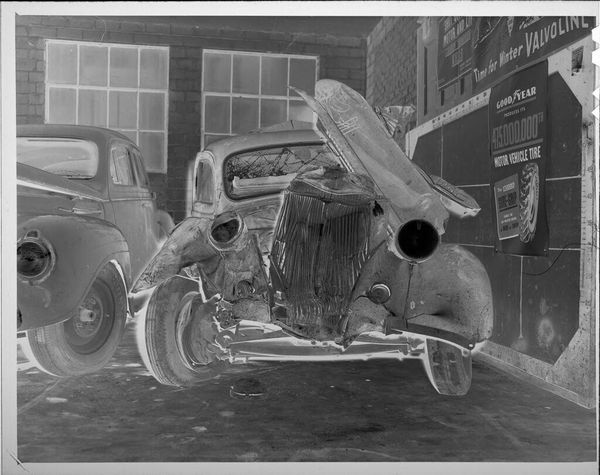 Curator: Lucian and Mary Brown's small-scale black and white photograph, "Untitled (car crash in snow)," presents us with a wrecked vehicle. Editor: It's stark, almost ghostly, with the inverted tones. The car’s form is surprisingly elegant even in destruction; the dark snow around it creates a sense of unease and isolation. Curator: Indeed. The Browns were very interested in the automobile as a means of production and how it impacted post-war American society. Editor: The formal qualities here are quite striking. The open car door creates a strong diagonal line, disrupting the composition. I wonder what the Browns wanted to convey about this disruption. Curator: I think they were interested in the labor surrounding the car, from its manufacture to its demise. The photograph is not just about the crash, but also a commentary on labor and the commodity. Editor: Perhaps. But I see a powerful statement about the fragility of even the most durable forms—the car, the road, and life itself. Curator: Ultimately, this small photograph speaks volumes about consumption and its consequences. Editor: A poignant reminder that even in wreckage, beauty, or at least compelling form, can be found.