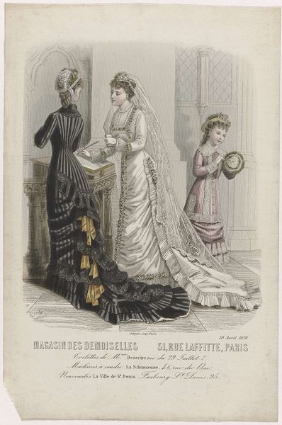 Editor: Here we have "Les Modes Parisiennes, 1871-1872, No. 1584: Foulards pour robes...", created sometime in 1871 or 1872 using mixed media including lithograph and print techniques. The artwork features women modeling high fashion. It evokes a certain sense of idealized elegance and grace, almost as though they're on stage. How do you interpret this work within its historical context? Curator: Well, seeing this through a historian's lens, the image presents a fascinating window into Parisian society shortly after the Franco-Prussian War and the Paris Commune. Consider what “Les Modes Parisiennes” represented during a time of rebuilding. The focus on fashion became a form of cultural reassertion, a way to project an image of normalcy and luxury despite the recent trauma. What does the prominent display of dresses signify in this particular socio-political environment? Editor: That's an interesting point. The clothing is so detailed, like the printmakers wanted to focus on the elaborate craftsmanship to say something about France's recovery and skills. Curator: Precisely. And beyond national recovery, consider the specific styles presented. Are they simply about aesthetics, or do they reflect changing roles and expectations for women in that era? Were they limited to just the wealthy? Editor: I hadn't thought about it that way. Maybe the details shown emphasize aspirational desires that could also trickle down to more women over time, so even the image serves a role? Curator: Exactly! Publications like “Les Modes Parisiennes” not only reflected current trends, but also participated in shaping desires and ideals, subtly influencing societal norms regarding beauty, class, and gender. I find that looking at these elements tells you so much about the role of art and media! Editor: Thanks for those insights! Now, I understand the cultural impact way better. Curator: It’s fascinating how much one image can tell us about a specific historical moment, isn’t it?