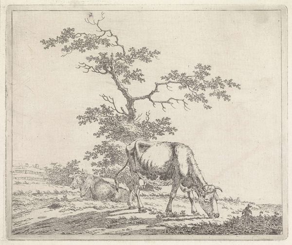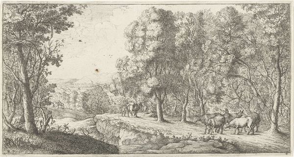 Curator: Let's discuss Jacques Callot's miniature etching, "Doe," held here at the Harvard Art Museums. I'm struck by its delicate lines. Editor: Indeed. I find it melancholic—the landscape rendered so sparsely, emphasizing the isolation of the animal. It's a study in contrasts, really. Curator: Callot's etching technique involved meticulous labor; the tooling, the acid baths, the printing. This was not merely representation but a material transformation, echoing the societal relationship with nature and its resources. Editor: But consider the form itself. The doe, so finely articulated, the trees sketched with such controlled chaos—the composition guides the eye. The linear perspective flattens, creating a tension between depth and surface. Curator: I agree about the surface, and the flatness of the image, but it is equally important to consider the materials at hand, readily available to be sold in the marketplace at the time. This brings into question the social structures governing Callot's production. Editor: Perhaps. I'm left pondering the emotional effect. The formal arrangement gives this image its lasting power. Curator: And for me, it's the material conditions that allow it to exist. Editor: A fascinating point of divergence.