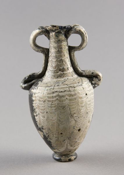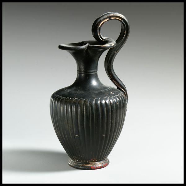 Curator: Let's discuss this terracotta oinochoe, a jug crafted around 300 BC, currently held in the Metropolitan Museum of Art. Editor: Immediately striking. The elegant, dark form with subtle striations feels remarkably modern despite its age. It is simultaneously weighty and sleek. Curator: It's a testament to the enduring sophistication of ancient craft. These vessels were essential in daily life for pouring wine or oil. Think about the hands that held it, the gatherings it served. We can see these gatherings reflected through a social lens - this vessel providing a conduit to the discussions, disagreements and resolutions which have come to define civilization. Editor: Function is undeniable, but consider the exquisite balance in the curve of the handle, mirroring the body's roundness. The interplay of light and shadow along the vertical lines—purely formal elements elevate it beyond utility. Curator: Beyond the aesthetics, we should also question how these types of vessels become commodities; this object representing both a part of Greek daily life as well as the rise of economic trade within the culture. It connects us to discussions around value and the societal systems which support it. Editor: Agreed. But the fluting also directs the eye upward, accentuating the vase's form. Look at how the artist employs a simple color palette - almost monochrome - to emphasize shape and texture, not narrative. Curator: This minimalism also perhaps speaks to the suppression of female identity as the matriarchal forms of ancient artistic expression fade to later allow for this sleek but non-descript artistic direction. It seems devoid of identity outside of pure societal need and function. Editor: I perceive an object refined through process, reduced to only its essential shape. The form transcends historical narrative. Curator: Perhaps, but that transcendence is intertwined with cultural shifts of the period. Food for thought. Editor: A vessel filled with history. Curator: And context.
