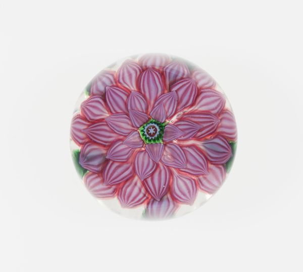 Curator: What a delightful find! We're looking at a glass paperweight, likely crafted by the Compagnie de Saint Louis sometime between 1845 and 1860. It’s currently held at The Art Institute of Chicago. Editor: It’s so quaint! At first glance, I’m struck by the enclosed and somewhat delicate nature of the piece. It feels very much like capturing a fleeting moment of beauty and holding it still, preserved forever. Curator: Yes, precisely! The historical context is important here. The rise of paperweights as collectable objects occurred alongside industrial glassmaking advancements. They became fashionable items, reflecting bourgeois tastes and consumer culture in the mid-19th century. The technique allowed for the mass production, and subsequent mass consumption, of luxury items. Editor: And I'm intrigued by the visual vocabulary! The central flower, a burst of red, is immediately engaging. Then your eye moves around to the circlet of millefiori that frames it all. Each small circle containing an intricate tiny bloom of its own! Curator: You're observing classical symbols that offered status in this period. The glass making profession in this time was largely occupied by male figures. A flower suggests something of the domestic in contrast, a sphere generally refers to the larger global. It reflects how society compartmentalized spaces for the genders at the time. Editor: Absolutely. The overall composition carries associations of gardens, which is often symbolically equated to a personal domain, doesn’t it? It's more than decorative; it's psychologically resonant with themes of nature subdued and beauty contained. Curator: Good point, as decorative as they are, items of beauty such as these carry significant weight. Museums such as this have preserved its imagery to remind viewers today of that complex legacy. Editor: Reflecting upon that symbolism deepens my appreciation for the artists ability to not just shape glass but emotion. A conversation through objects with echoes of history. Curator: Indeed, thank you, looking at this once common item now reveals it held stories within the materials it had.
