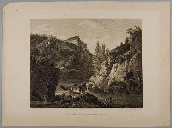 Curator: M. S. Barenger’s print, titled "Rocks in Middleton Dale," captures a striking landscape. It's currently held in the Harvard Art Museums collection. What are your immediate impressions? Editor: It's the house, isn't it? That tiny human dwelling dwarfed by the landscape. It makes you wonder about vulnerability and persistence. Curator: Indeed, the placement of the building underscores the power of nature, an element often romanticized in the period it was made. The choice of the site to depict highlights its inherent cultural appeal. Editor: It's a sublime place, that's for sure. A place to retreat to, to discover yourself, but also a reminder that it could all be gone in a flash. Curator: That tension between the domestic and the monumental was also a powerful political metaphor during a period of great social change. Editor: I suppose, but I'm just thinking about the light and how it touches those rocks. Makes me want to climb! Curator: So, ultimately, we are left contemplating the relationship between humanity and the enduring grandeur of the natural world. Editor: Absolutely. A reminder that we're just passing through, leaving a mark, but never truly conquering.