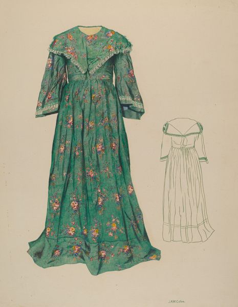 Editor: Here we have a pencil drawing entitled "Evening Dress," dating from around 1937, by Ray Price. It features what appears to be a sketch of a long, green gown. I’m really drawn to the way the pencil strokes mimic the fabric's texture. What strikes you most about it? Curator: I’m fascinated by the depiction of dressmaking itself. The labor and the physical process of creation are highlighted in this image, from the initial design sketch to the potential materiality of the dress. Note how the visible pencil strokes and even the secondary sketch underscore the artist's, and likely the garment workers’, hand in the production of fashion. How might this contrast with the idea of ‘high art’ portraits of the time? Editor: That's interesting! I hadn’t considered the implications of it being just a drawing *of* clothing rather than the clothing itself. Curator: Precisely. The sketch acts as a material document. Consider also the role of fashion magazines in the 1930s and the rise of consumer culture. How might this drawing fit into that context as a blueprint of consumption and the associated labor practices, instead of celebrating elitist consumerism? Editor: I guess the drawing invites us to consider not just the final glamorous product, but all the work and industry involved. Now I wonder about who this artist was and whether he/she also labored in clothing factories? Curator: Exactly. It becomes less about an ideal evening, and more about the socio-economic landscape that allows such evenings – and dresses – to exist. This artwork, by simply representing a garment's construction, critiques the entire fashion apparatus. Editor: That shifts my understanding completely! Thank you. I now see this "Evening Dress" not just as an object of beauty, but also as a representation of work. Curator: Indeed, considering its means of production can change our perception entirely.