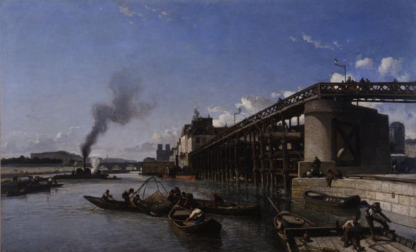 Editor: Walter Greaves’ "Old Battersea Bridge" presents a rather industrial landscape. The visible bridge construction and the factories in the background make me wonder about the labor involved. What can you tell me about this piece? Curator: Consider the materiality; the wood and the paint are products of industry and trade. Greaves paints a London transformed by industrial capitalism, the bridge a symbol of connection and the factories of production, their chimneys dominating the skyline. Editor: So, it's not just about aesthetics, but also about the materials and their origins? Curator: Precisely! The artwork becomes a document of its time, reflecting the social and economic conditions of Victorian England. Editor: I’m definitely seeing the painting, and the era, in a whole new light now.