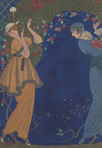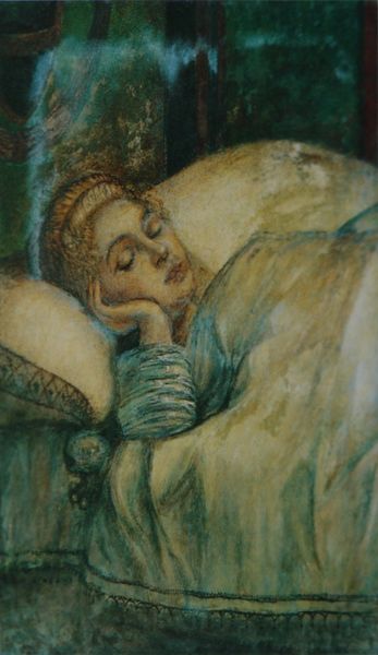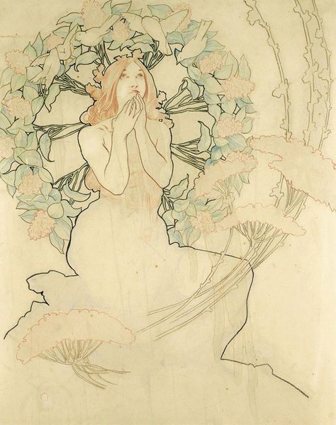 Curator: Frances Macdonald's "The Choice," painted in 1886, draws us into a world thick with symbolism, a key feature of the Art Nouveau movement. It’s currently housed here at the Walker Art Gallery. What's your immediate take on it? Editor: Ethereal. It feels like peering into a dream, or maybe a half-remembered myth. The colors are so muted, almost ghostly. Are they trapped in a memory? Or are they a symbol of choosing a path and having to leave others behind? The figures and roses swirl together... it is like an eerie perfume bottled in a painting! Curator: The roses are key! They're densely layered. We see these repeated throughout the canvas; and Macdonald’s decision to depict them signals Victorian notions of femininity and beauty, intertwined with an undercurrent of decay and, well, a sharp awareness of the limitations placed on women. Editor: It almost feels like the roses are trapping the figure rather than her existing amongst them. Speaking of which, what do you make of those stark figures in the background? They could be sisters, spectres from another time. There is one looking up. Longing to escape their static stance. What are they meant to symbolize? Curator: Many see them as representing societal expectations, maybe the constraints placed on the central figure, judging her possible choices. That string of golden dots… It is easy to interpret them as representing opportunity but there also appears a heaviness, an un-ignorable weight. The use of the nude figure also touches upon ideals of beauty versus vulnerability, as this canvas represents one of the earliest forays into feminist art. Editor: So, a lot of expectation and constraint swirling amongst all the rose imagery... Even today you feel the power of what she managed to pull together in her artistry. The ambiguity makes it perversely timeless. Even in the whispers of the painting, it has a lot to say about the idea of options versus the reality of what freedom we have. It gives pause. Curator: Absolutely, it is a wonderful demonstration of visual encoding to carry weighty context through images. These were themes MacDonald continued to explore throughout her work. Editor: Exactly, something in the mood clings to you even after you turn away. An amazing way to summarize all the ways that a choice can resonate... across a life and even across time itself!