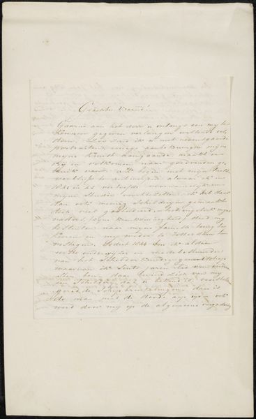 Curator: Looking at this piece, I am struck by the intimacy of it, how personal and revealing a handwritten letter can be. Editor: Indeed. Here we have a work attributed to Joannes Josephus de Loose, titled "Brief aan Liévin Amand Marie de Bast," created sometime between 1821 and 1826. It’s rendered in ink on paper and presently resides in the Rijksmuseum collection. To me, its very age speaks of history and the enduring human desire for communication. Curator: Absolutely, you feel the echo of history within its fragile state. But what does a letter represent? On one hand, it's the message, the information being exchanged. On the other, it's a tangible representation of connection, almost like a surrogate for physical presence. Editor: It is interesting you call attention to that, considering its place within 19th-century Romanticism and history painting. Consider, too, the sociopolitical context. Who were these people? Why was it important for them to communicate this specific message in this way, and what did the institutions of postal service and privacy mean to their relationship? Curator: I immediately start considering its form—the deliberate curves and flourishes of the handwriting, the layout of the words on the page. The way the ink has faded, the creases in the paper—all speak to the passage of time, the journeys the letter has undertaken, and the hands it has passed through. It is now also, of course, a curated object. What we interpret now isn't merely a note to a distant person, but part of our contemporary social understanding. Editor: Precisely. It invites questions. Was it delivered? What was the reply? It’s a story contained, and yet eternally unfolding through its viewers. Curator: It certainly causes us to reflect on our own relationship with the written word today, how our methods of communication shape and reflect who we are. Editor: I am left pondering the immense public value of deeply private things. Thanks for sharing this reflection with me. Curator: It has been enlightening for me as well. Thanks for exploring the nature of letter writing.