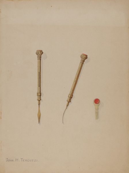 Curator: Welcome. We're looking at "Nails and Pins," a drawing completed around 1937 by Harry G. Aberdeen. The piece primarily employs graphite on paper, rendering a magnified study of, well, nails and pins. Editor: Huh. At first glance, it feels like a bizarre still life. They're so meticulously rendered, but it's nails and pins. I get a very clinical, almost surgical vibe, staring down at something incredibly small, suddenly large. Curator: Interesting observation. You touch upon the crux of its impact. Aberdeen’s work challenges the ordinary, elevating everyday objects to subjects worthy of artistic examination. This piece speaks to the prevailing artistic currents of the time. Editor: Elevating...that's polite! Seriously, though, I’m caught by this very dry hyper-realism. What statement could you possibly make about nails? Curator: The absence of overt emotion and symbolism speaks volumes. Think about the rise of industrial design and precision in manufacturing around this time. Everyday tools were gaining a new kind of aesthetic value in mass society, but this is, crucially, hand drawn. Editor: But that tension is *so* compelling. Like, a perfect rendering, that almost looks mass produced, and there are actually different sizes present here as well. Were these some designer nails or some odd study, and by rendering them does that give them purpose? Are nails like paintbrushes for the home renovator? I find myself making connections I didn't know I'd ever make. Curator: Exactly. Its power lies in this ability to prompt reflection on the seemingly mundane. In isolating these forms, Aberdeen compels us to acknowledge and contemplate their significance in shaping our world. Editor: It's funny, isn't it? How something so utilitarian can become a window into so much more. Thanks for digging a little deeper with me. I feel like I've unexpectedly made friends with a nail today. Curator: Precisely! Art has the power to re-frame and prompt fresh perspectives. And who knew that reflection could begin with a simple pin.
