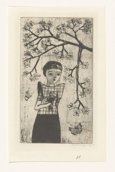 Curator: Benton Spruance created this piece, entitled "Thornbush", in 1955, employing the technique of etching to render its powerful imagery. Editor: The first thing that strikes me is the almost unsettling juxtaposition of delicacy and discomfort. There's a strange tenderness in the figure’s gaze, yet they’re embracing a prickly thornbush. Curator: It's tempting to interpret that perceived tenderness through a lens of social responsibility. During this period, Spruance’s art frequently reflected his deep concern with issues of social justice and human vulnerability. He often employed figures to convey a sense of alienation, but also a quiet resilience. Editor: That’s interesting, but from a purely compositional perspective, the rigid angles of the plant are echoed in the slight tension we see around the subject’s mouth and brow. See how that contrasts with the curves of the bird to the left? I wonder if that points to an inner conflict in the figure itself. Curator: Possibly. It may represent societal pressures imposed on them, symbolized by the thornbush—a burden carried but perhaps also a defense mechanism against further harm. Consider how Spruance might be critiquing oppressive systems by highlighting the emotional labor required for survival within them. Editor: I can see that. I was struck, too, by the muted palette; that pale yellow backdrop really intensifies the greens and grays. It creates an almost otherworldly feel. The lines, while present, seem almost hesitant. What do you think the material of the etching process lends to the overall tone? Curator: I believe Spruance may be inviting viewers to consider those within marginalized communities whose burdens are often invisible to those in power. His printmaking allowed for wider dissemination, extending the conversation beyond gallery walls to touch the consciences of a broader public, particularly regarding civil rights issues in his time. Editor: It’s interesting how, even without knowing the context, the formal elements contribute to a similar sense of unease and quiet resistance. I guess that’s a testament to the artist’s skill and intentionality. Curator: Indeed. Spruance's 'Thornbush' serves as a timeless reflection on resilience, struggle, and ultimately, the quiet dignity of the human spirit. Editor: An introspective moment—it’s quite thought-provoking in that way.