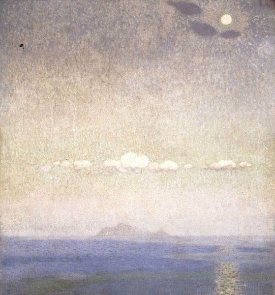 Emil Carlsen created this painting, "Moonlight," with oil on canvas during a time when American art was deeply influenced by European trends, particularly Impressionism and tonalism. Carlsen's work reflects a broader cultural interest in capturing atmospheric effects and subjective experiences of nature. The hazy, dreamlike quality aligns with the tonalist aesthetic, which emphasized mood and subtle gradations of color over precise representation. Born in Denmark, but having become a prominent figure in the American art scene, Carlsen navigated the art world through exhibitions at institutions like the National Academy of Design, contributing to the evolving definition of American art. To truly understand Carlsen's "Moonlight," we need to delve into exhibition records, period art criticism, and biographical details. This kind of historical research reminds us that art's meaning is always shaped by its specific social and institutional contexts.
