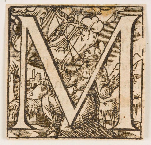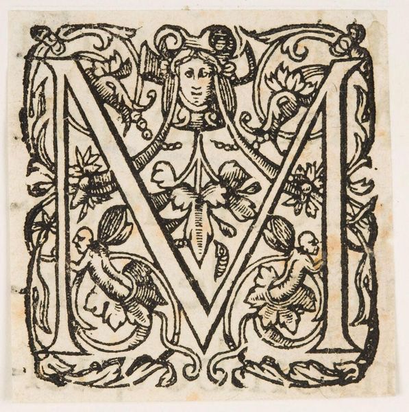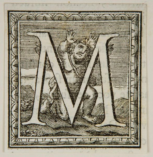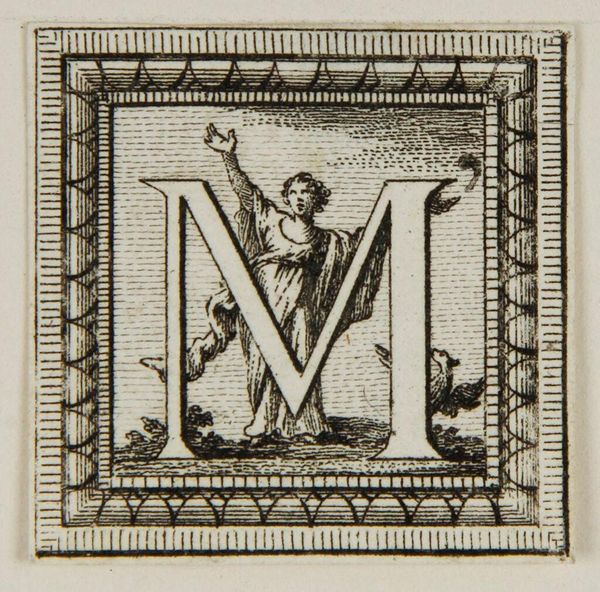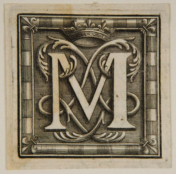 Editor: Here we have a small but stately print, "Letter M with Coat of Arms," likely from the late 17th or early 18th century. It's so detailed for its size! It seems like a perfect little world of royal symbols. What do you make of it? Curator: It whispers of courtly life, doesn't it? Imagine the hand that meticulously carved each line, each fleur-de-lis. It's a dedication, a flourish. Did you notice the drapery? Almost like a stage curtain framing royalty. Perhaps a gift, a token of loyalty… Editor: Yes, I see that now! It’s like a performance. All that concentrated symbolism in such a tiny format. Curator: Exactly. Think of it as a potent symbol in miniature. Every element is charged with meaning. The craftsmanship alone speaks volumes. Editor: So much to unpack in something so small. Thanks for pointing out the details. Curator: My pleasure! It's in these small things that history sometimes speaks the loudest.