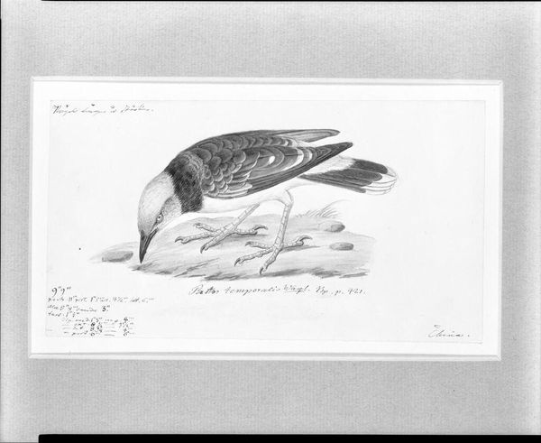 Editor: This is Heinrich Gottlieb Ludwig Reichenbach's "Study of a Bird (Irena Puella)." It's undated, but it’s a pen and ink drawing. The level of detail is striking, almost scientific. What do you see in the precise rendering of the bird's plumage? Curator: The texture is quite remarkable. Notice the contrasting patterns; the delicate strokes defining each feather against the smooth, almost metallic sheen on the wing. Reichenbach meticulously utilizes line weight and density to create depth, effectively capturing the bird's form. Editor: So, the composition itself is key? Curator: Precisely. The bird's diagonal placement on the branch creates a dynamic tension within the frame, a visual energy contained by the precision of the line work. It is this interplay of form and technique that elevates the study beyond mere representation. Editor: That’s a great point; I hadn't considered the energy in the composition itself. Curator: Indeed. It invites us to examine not just what is depicted, but how it is depicted.