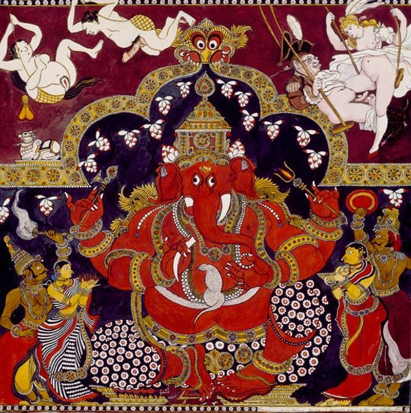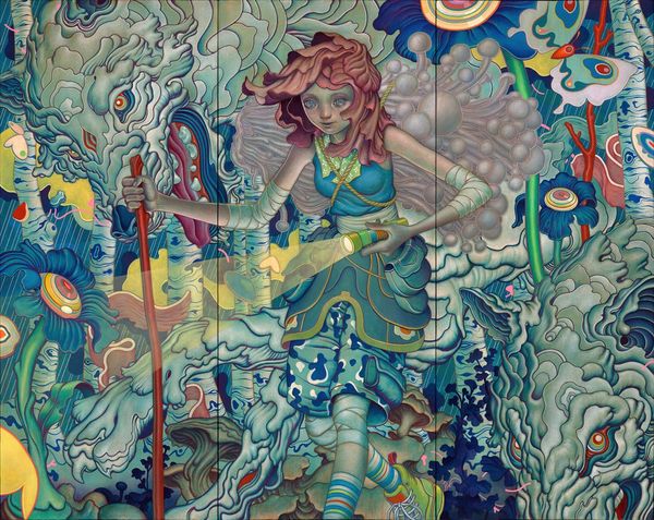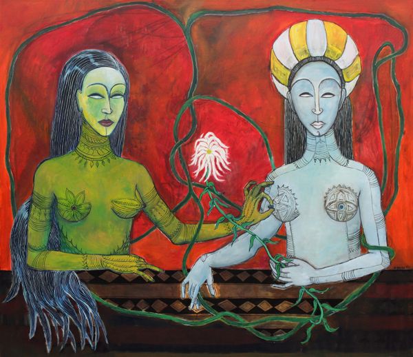 Curator: Here we have Vsevolod Maksymovych's painting "Fairy Tale Princess," crafted with tempera on, what appears to be, textile. What are your initial thoughts? Editor: Wow. That is... intense. My first impression is overwhelmingly red—a crimson haze. It's dramatic and a little unsettling, like a half-remembered dream or a theatrical scene lit too harshly. Curator: I'd agree on the intensity. Thinking of historical paintings and fairy tale narratives, the artwork certainly prompts an intersectional consideration of power and representation. Who is allowed to be a princess? What constraints and expectations are attached? Editor: It does feel constrained. She’s surrounded, almost consumed, by the redness and these shadowed figures lurking in the background. It’s far from the Disney ideal, isn’t it? More like a cautionary tale. There is a dark beauty in the layering effect on her red dress and around her figure; how was this effect created? Curator: Tempera allows for layered pigment application. Also, textile as the foundation gives it a slightly blurred finish and provides insight into craft production versus the fine arts. There may be interesting conversations concerning material labor here, who crafted these clothes, or for whom the depicted stories and images cater? Editor: Exactly! And, you know, it’s making me think about the theatricality of royalty in general. Aren't they always playing a role? All this heavy, ornate costuming, the elaborate backdrops… it’s a performance of power. Even in paintings like these it seems. I’m especially drawn to the subjects peering over the princess's shoulder. They almost seem jealous and maybe ready to dethrone her! Curator: A very potent interpretation, reflecting the struggle within and for power, isn’t it? Perhaps, in rethinking familiar and assumed images and materials of a "fairy tale princess", the artist urges us to acknowledge that representation always involves, and sometimes inflicts, a kind of violence. Editor: Well, thinking about it, maybe all fairy tales involve violence in some way or another, no? Makes one really want to rewrite them. Thanks for revealing the context of such a thought-provoking piece! Curator: Likewise! Thank you for offering your insights.
