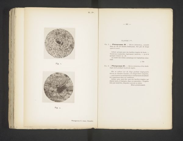 Editor: An intriguing and unsettling composition – a glimpse into an unseen world. I find its stark presentation, spread across the open pages, to be quite impactful. Curator: Indeed. What we have here is "Twee microscoopopnamen van bederfbacteriën," or Two Microscopic Views of Bacteria, by Gustav Hauser, a lithograph print created before 1885. It offers us a scientifically oriented representation presented in a highly structured format. Editor: The bacteria themselves – especially in the upper field – resemble dark blots, menacing almost. Do these forms suggest something about societal anxieties of the time? Perhaps germ theory and emerging understandings of disease? Curator: That’s an insightful perspective. Consider how the artist deploys contrasting values to create these distinct shapes. The arrangement isn’t random; it emphasizes pattern, a kind of terrifying formalism embedded within perceived chaos. Editor: Chaos rendered visible and thus made 'knowable.' The round fields also lend an alchemical quality to the page – peering into base elements to perhaps understand fundamental forces that drive organic and even societal processes. I notice also, that they resemble eyes, creating a sensation of being scrutinized. Curator: A potent symbolic reading! Structurally, these two circular frames demand comparison. The print maker forces a correlation. We're encouraged to find symmetries but equally to discover what fractures or distinguishes. Editor: Perhaps a reminder that these destructive forces, though alienating, are, like those of the 'macro' world, subject to underlying organizational imperatives and maybe –just maybe– control? What thoughts emerge as you visually reflect on these bacterial depictions, stripped bare of any further pictorial support? Curator: I observe the deliberate starkness. The choice to present the science plainly elevates objective, representational elements. Yet that tension with emotional unease or threat is so deeply suggestive – to have it come about through such rigorously structured and presented imagery. Editor: A disquieting convergence between objectivity and a lurking, primeval menace, skillfully visualized through form. Curator: Quite right. These images offer an interesting synthesis—or perhaps conflict—between scientific realism and deeper cultural associations.