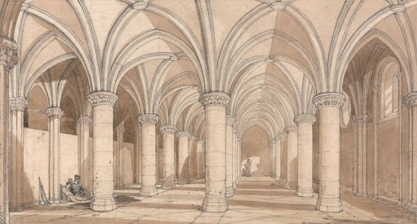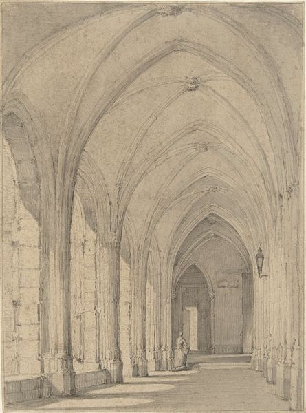 Editor: This is Oscar Bluemner's "Koln, Maria-Capitol" from 1892. It's rendered in ink, pencil, and pen, creating this detailed depiction of an arched corridor. I find the heavy use of line gives it a sense of confinement and historical weight, even though it's just a drawing. How do you interpret this work? Curator: It's crucial to acknowledge how the historical context impacts the viewing of this image. Consider, in 1892, what did architectural representation mean? Bluemner chooses the cloister, a space of enclosure, reflection, and often, religious or spiritual dedication. Think about who has historically had access to spaces like these, and who has been excluded. The strong perspective lines almost push us back, right? What does that forced perspective say about the artist’s relationship with institutionalized space and knowledge? Editor: That's interesting, I was focusing more on the visual elements but I see what you mean about access and history. The rigid structure and stark contrast definitely evoke that. Curator: Exactly. Bluemner’s choice isn't simply about aesthetics. It invites us to investigate the power dynamics inherent in architecture and who benefits. It’s about space, place, and power. What power does this space emanate in your eyes? Editor: Thinking about it now, there's also an implication of separation, or maybe contemplation within that separation... Curator: Precisely. Consider then how these kinds of spaces have historically excluded certain groups – women, people of color, the working class – shaping not only the physical landscape but also social hierarchies. Editor: That makes me reconsider the artwork entirely. I hadn't really thought about the social commentary a seemingly simple drawing of a cloister could convey. Curator: Art invites those critical dialogues, always. That's where its power truly lies: prompting questions and revealing unspoken narratives of gender, power and privilege. Editor: I will never see perspective the same way, thank you. Curator: And thank you for bringing a fresh perspective!