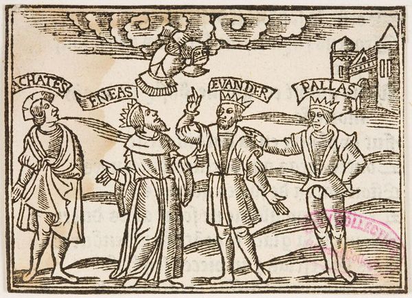 Curator: This is Illustration LXVIII from an unknown artist, housed here at the Harvard Art Museums. Editor: It feels so busy, almost chaotic, but in a celebratory way. Lots of figures crammed into a small space. Curator: Yes, it's a woodcut, which accounts for the dense composition and strong contrast. The scene depicts Dido and Aeneas at their famous banquet. Editor: Ah, I see the banners identifying the characters. But what’s striking is the mix of grandeur and... awkwardness. The figures seem stiff, almost puppet-like. Curator: That's characteristic of the era. Woodcuts were often used for didactic purposes. The image aims to convey the story rather than realistic representation. The context, likely illustrating a printed book, informs its creation. Editor: Still, the symbolism is potent. This gathering, this union, is inherently political, setting the stage for both alliance and betrayal. Curator: Absolutely. Seeing it through the lens of power dynamics adds another layer. Editor: It makes one consider the image’s purpose in shaping perceptions of leadership and relationships in its time. Curator: Indeed, a single image can hold so much history. Editor: And prompt so much reflection on how stories of power still resonate.
