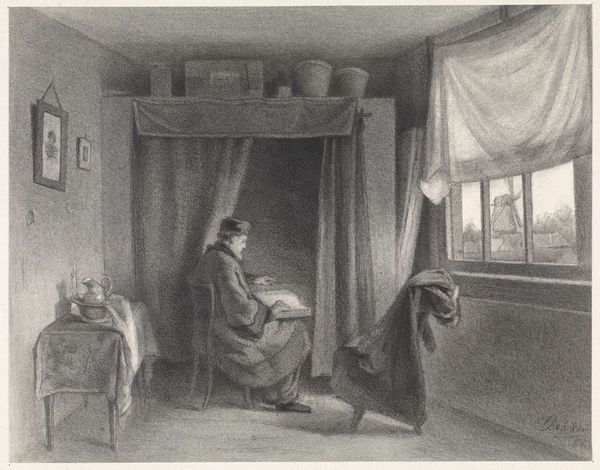 Editor: This is David Bles's "Ferdinand Huyck writing Henriëtte Blaek’s Initials on the Window Pane." It's a drawing made with pencil and charcoal, and believed to have been made between 1831 and 1899. I am really drawn to its intimate, quiet atmosphere. What can you tell me about the work? Curator: Note the tonal range achieved through the juxtaposition of charcoal and pencil. The artist’s masterful control over the medium generates a subdued yet effective play of light and shadow, directing the viewer’s eye to the window. This formal device accentuates the romantic tenor. The window and its panes act as both a surface of inscription, but also, simultaneously, an intermediary membrane between the subject and a world of affect and projected fantasy. What does this liminal space represent for you? Editor: I guess I hadn't thought of the window as a formal element creating an affect, only as a compositional device drawing me into the depicted scene. Do you mean like a border separating him from her, a kind of melancholy longing? Curator: Precisely. The interior setting, carefully delineated through line and shading, and the exterior scene beyond the glass work together. The texture of the wall contrasts against the delicate rendering of the window, highlighting the artwork's aesthetic structure as one defined by contrasting but codependent, elements. We cannot understand the man within, without the woman just outside, represented only through script, upon a divider. Editor: That's so interesting; thinking of it as an aesthetic construction heightens the emotion, rather than making it less personal. Curator: The beauty of formal analysis lies precisely there - seeing how artistic construction facilitates human emotion. Editor: I'll never look at windows in paintings the same way again. Thanks so much!