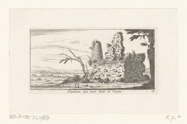 Curator: This is a drawing called "Landscape (Windbent Tree)," attributed to an imitator of Guercino. Editor: It feels immediately melancholic, doesn't it? The stark contrasts and the way the tree is almost fighting against the wind… it's quite dramatic. Curator: The windbent tree is a recurring motif throughout art history, often symbolizing resilience, but also the effects of time and the power of nature. Here, the figures in the foreground almost seem to contemplate this struggle. Editor: And they are clearly figures of leisure. The drawing speaks to the artist’s class position, doesn’t it? The luxury of observing nature rather than being subjected to it. Curator: The artist uses a very economical line to achieve a sense of depth, and the tree is rendered with almost obsessive detail. Editor: Yes, the tree feels like a metaphor for the human condition, constantly shaped by external forces, while those figures in the foreground are simply observing. Curator: It's a powerful reminder of how we relate to our environment. Editor: Indeed, and a prompt to reflect on who has the privilege to contemplate it.