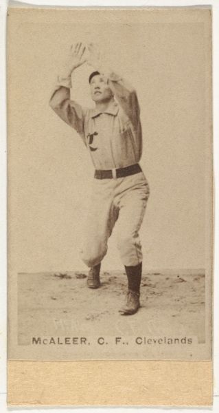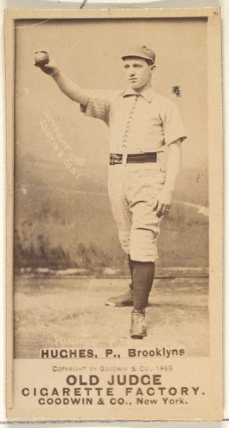 This photographic print, made by Goodwin & Company in the late 19th century, presents Henry Gruber, a pitcher for Cleveland, within the Old Judge Cigarettes series. The sepia tones evoke a sense of nostalgia, while the composition centers Gruber in mid-pitch, capturing a dynamic moment frozen in time. The photograph's structure emphasizes Gruber’s form and the implied motion of his throw, the off-white background is neutral and plain, placing the figure in the foreground. The formal qualities of the image – the balance of light and shadow, the crispness of detail – invite a semiotic reading. Gruber's attire and stance are codes that signify athleticism and professionalism. The text at the bottom, advertising Old Judge Cigarettes, places the image within a commercial context, where celebrity and sport are tools for marketing. This juxtaposition challenges the romantic ideal of the athlete, intertwining it with consumer culture. As you consider this print, think about how it functions within the broader discourse of advertising, sport, and early commercial photography, constantly evolving, and inviting new interpretations.