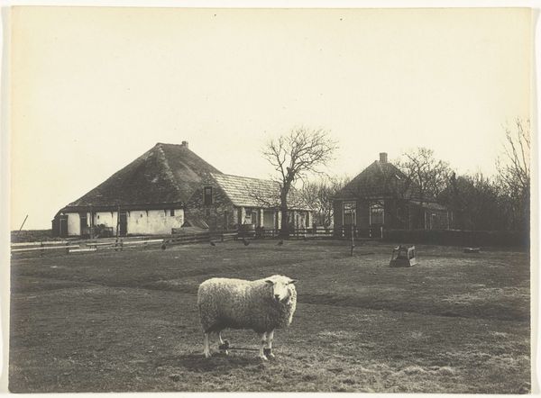 Editor: This photograph, "Pigs and Cows in a Meadow on the Twickel Estate in Delden", a gelatin silver print, was taken by Richard Tepe sometime between 1900 and 1930. It gives me a sense of pastoral life and quiet, rural simplicity... although maybe a little bleak? What stands out to you? Curator: Bleak, perhaps, yet isn't there a strange beauty in that simplicity? I see a sort of echo of Dutch Golden Age landscapes, that familiar embrace of the everyday, of working the land. The starkness of the monochrome only amplifies the raw texture of the land, the plump heft of the animals... it's an honest image. Almost unflinching in its portrayal of agricultural life. I wonder, do you see how Tepe places the animals, almost like figures in a genre painting? Editor: I do see what you mean; the placement is really thoughtful, almost posed, not at all as casual as I had first perceived. It almost seems that there is an "other" presence, on the back, perhaps one of the estate workers... Curator: Exactly! It gives us some reference as for the landscape scale and adds an intriguing human element, no? I keep thinking about the lack of idealization...it avoids romantic clichés of the countryside. It hints at the realities and also dignity, dare I say, inherent to agrarian existance, maybe even social status as for those working in the Twickel Estate. Do you see those shades reflected in the cloudy sky? Editor: Yes, now that you point it out, the tonal range, is incredible! So, it's more than just documentary photography. There is artistic expression embedded there, too. Curator: Precisely. I love how Tepe transforms this seemingly mundane scene into something profoundly beautiful and compelling. What did you think, now? Editor: I now see the composition, and all its depth of nuances. It encourages a whole different level of appreciation for rural landscapes, and black and white photography. Curator: And sometimes that is all we need, right? Just another pair of eyes!
