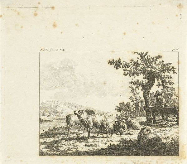 Curator: "Twee mannen met hun paarden bij een drinkplaats," or "Two Men with their Horses at a Watering Place," an etching by Jan Peeter Verdussen, made sometime between 1710 and 1763, shows a seemingly everyday scene. It’s a glimpse into the world of rural life of the time. What are your first thoughts? Editor: My first thought is quiet simplicity. The delicate lines, the soft shading—it almost feels like a memory captured in ink. But there’s also a feeling of labor and reliance here, you know? A connection between humans, animals, and the land. Curator: Indeed. Verdussen was part of a long tradition of genre painting, capturing scenes of everyday life, and often these types of images circulated as popular prints, reflecting a growing interest in rural settings outside the urban centers. What's intriguing is the role of the horses here; beyond their functional use, they are also companions and symbols of status, reflecting how integral these animals were to Dutch society. Editor: It strikes me how subtly class and labor are depicted here. The scene feels picturesque, almost idyllic, but the presence of the watering place suggests reliance on a shared resource, maybe an access point within an inequitable feudal structure, even, rather than romantic ideas about Dutch painting that are promoted by institutions today. Do you see any specific sociopolitical meaning in how Verdussen chose to depict the men and horses together, though? Curator: Verdussen gives us very few visual clues. I would resist reading this image as politically charged without additional textual support. Rather, such genre scenes served to uphold traditional social values. However, we can use this scene to question the notion of leisure itself—how did ideas of labor and social hierarchies play out in leisure activities? Were those pleasures equally shared by all? I see it more as an observation on contemporary Dutch society, a snapshot of working life rather than necessarily social critique. Editor: I think that's a really helpful insight. It reminds us to be vigilant, examining how narratives, like Verdussen’s, both represent and shape the world around us, maybe in ways that serve particular audiences. We must think carefully about access and mobility, both within Verdussen's etching, but also about who has access to art institutions like the Rijksmuseum, where we stand now. Curator: Precisely. Verdussen’s work encourages us to not just see the past, but to consider how it influences our present perspectives. Editor: It certainly does for me, particularly within today’s socio-political climate!