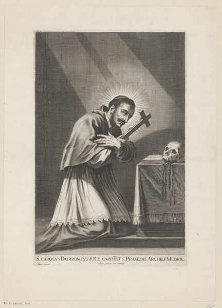 Curator: There’s a powerful stillness emanating from this 17th-century print. It's titled "Portret van Jezuïet Johannes (Jan) Berchmans", placing a spotlight on a Jesuit, rendered by Boëtius Adamsz. Bolswert sometime between 1621 and 1633. Editor: Indeed, and that stillness is profoundly unsettling! The heavy shadows, the stark contrast between light and dark... It lends a rather somber and weighty atmosphere. Curator: Absolutely. Bolswert masterfully uses symbols that were deeply ingrained in the cultural and spiritual understanding of the time. Consider the skull. Editor: Ah yes, that memento mori tradition. Placed so prominently in the foreground, it forces viewers to confront the transient nature of life. How was this imagery being leveraged in this period, socially? Curator: Prints like this played a vital role in disseminating images and ideas during the Counter-Reformation. By presenting Berchmans in a state of devout contemplation with his crucifix, rosary and religious book Bolswert encourages imitation. Editor: I notice the interplay of light and shadow; particularly that light illuminating an image of Mary with the Christ child above him. The gaze seems meant to draw our eyes heavenward. Curator: Precisely. This strategic composition invites viewers to see Berchmans as a model of piety. Bolswert emphasizes both worldly and divine allegiances for those caught up in this socio-religious and politically fraught period. Editor: I'm especially struck by Berchmans pointing with one finger toward that memento mori while simultaneously, seemingly lost in reverie and thought, his other arm wrapped around the crucifix. His robes look almost as heavy as this task must have felt! Curator: The artist really knew how to draw meaning from existing conventions of art history in a novel, meaningful way, for the era and viewers of his work. Editor: It does makes me wonder about the image's immediate impact, versus how it affects audiences viewing this today at the Rijksmuseum, removed from the urgent battles Bolswert and others would have faced at the time. Curator: The weight of tradition, cultural memory – they linger, don't they? And so, Bolswert’s “Portret van Jezuïet Johannes (Jan) Berchmans” provides much to consider about both the man and the age that forged him. Editor: I agree. An image can have many lives; how a work engages a viewer is a reminder that an artwork isn't just a snapshot but rather part of a longer narrative.