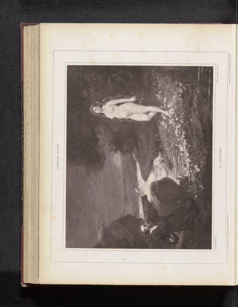Editor: So, here we have a photogravure of Nicolas Tassaert’s painting "The Temptation of Saint Hilarion," dating from before 1881. The tonality seems very dramatic, and the bodies are almost floating. I'm curious, what can you tell me about it from your perspective? Curator: Well, looking at this reproduction, I'm immediately drawn to the labor embedded in its production. Consider the original painting, and the means to replicate it via photogravure. This isn’t simply about high art, but about the craft, the labor and the materials employed for broader consumption of images. Do you think the accessibility afforded by reproductions alters its meaning? Editor: I hadn’t considered it that way, but absolutely. It transforms a singular, presumably inaccessible artwork into something more widely circulated. Curator: Precisely. And let’s think about what a ‘temptation’ meant in pre-industrial Europe versus today. Was Hilarion being tempted to leave behind just his own craft, but his control and access to a new social context afforded by craft guilds of the period? Are these floating figures commodities being offered, made through global, perhaps immoral means? Editor: That's fascinating. The print makes it harder to determine the value of labor in the making of the work as compared to viewing the painting itself. Curator: Indeed! And in turn, this reproductive medium itself introduces its own form of value. The labor is hidden further still behind these industrial processes. Are we complicit consumers then of exploitation when consuming images reproduced en masse? Editor: So the focus isn’t solely on the saint and temptation but the complex systems that make the image itself? That definitely shifts my perception. Curator: Exactly! These layers of materiality challenge traditional art historical interpretation. I now am intrigued to see this perspective applied to this and future artworks.