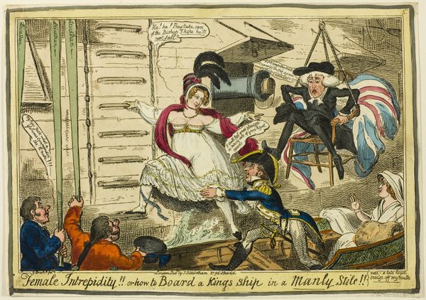This hand-colored etching, "Political-Ravishment," was made by James Gillray, and printed in 1797. Gillray used etching, a printmaking technique that democratized image production during this period. An image is scratched into a metal plate, which is then inked and pressed onto paper. Here, he adds color by hand, layering further labor onto the industrial reproduction of the original design. The title suggests that the print is a political cartoon. In the work, we see an assault on a figure called "The Old Lady of Threadneedle-Street," slang for the Bank of England. The satirical nature of the print speaks to the complex relationship between the printmaker, the art market, and the wider public, as it challenges the traditional art world. Gillray's image satirizes the political and financial anxieties of the time, which offers a window into the social context of late 18th-century England, challenging traditional notions of art as separate from everyday life and political commentary.