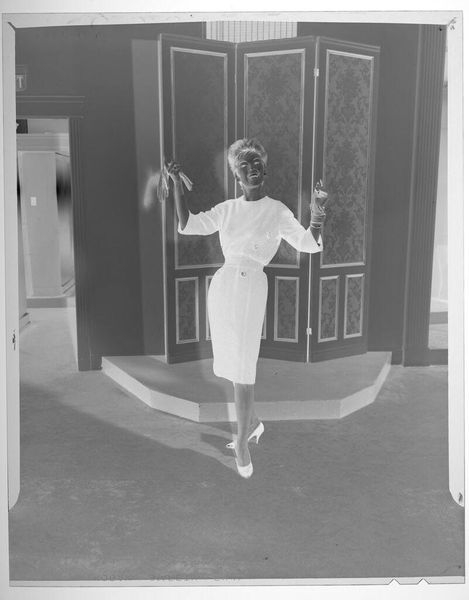 Editor: Here we have an untitled fashion portrait by Martin Schweig, showing a woman holding a glove. The negative image gives it a ghostly feel. What can you tell me about this photograph? Curator: Considering this photograph through a materialist lens, I immediately note the emphasis on the production of fashion and its inherent labor. The woman's pose is carefully constructed, indicating the social context of idealized presentation. Editor: So, the image itself is a commodity? Curator: Exactly. The photograph, as a reproducible image, becomes part of the cycle of consumption and desire. It's a product of industry and reflects the socio-economic structures of its time. Both intriguing and unsettling. Editor: Thanks! I hadn't considered the broader economic implications.