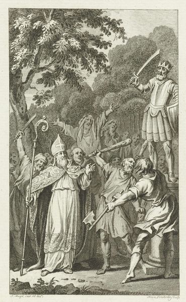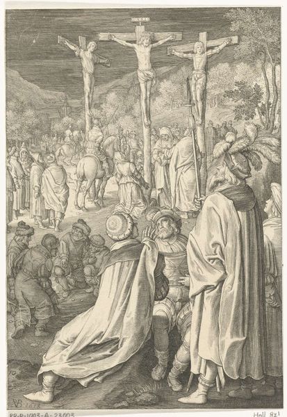 Editor: This is "Johannes de Doper spreekt met vier mannen," or "John the Baptist speaking with four men," an engraving made by Hans Liefrinck in 1553. The figures look serious, perhaps contemplative. The details in the landscape are fascinating, contrasting with the simplicity of the men’s robes. How do you interpret this work within its historical context? Curator: This print offers a glimpse into the social and religious tensions of the 16th century. Consider the Northern Renaissance backdrop: the Reformation is in full swing. How might Liefrinck's portrayal of John the Baptist, a figure of radical preaching and social critique, resonate with audiences navigating these tumultuous times? Editor: That's interesting, especially in how John the Baptist challenges established norms. It appears he's directly addressing these men... do you think this could be interpreted as an act of defiance against religious authority? Curator: Absolutely. The setting itself contributes to this narrative. Instead of placing the scene within a grand cathedral, Liefrinck situates it in a rugged, natural environment. This emphasizes the idea of a spirituality rooted outside the confines of traditional institutions, resonating with Reformation ideals. What does that visual decision mean to you? Editor: That makes so much sense! The figures are very human and humble within this wild landscape. I initially saw the piece simply as a biblical scene, but you’ve illuminated how it interacts with Reformation-era politics and spirituality. Thank you! Curator: The layers of context are always there, enriching the way we see the past and understand the continuing narratives about power, religion, and individual agency today.