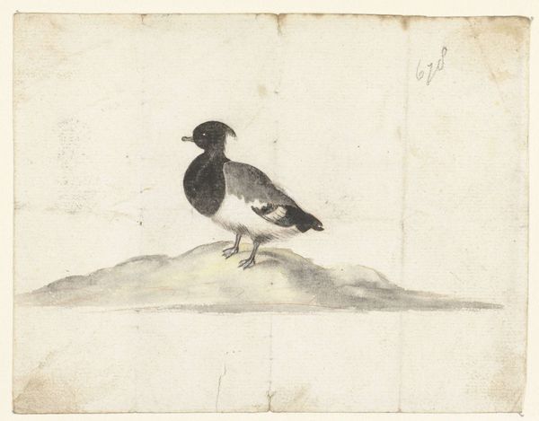 Curator: Here we have "A Magpie," a lovely watercolor work attributed to an anonymous artist, housed here at the Harvard Art Museums. It measures a modest 12 by 17 centimeters. Editor: It’s such a quiet little painting! Makes me think of a page from a naturalist's notebook, capturing a fleeting moment. There’s something so delicate about the brushstrokes. Curator: These types of studies became increasingly popular as scientific illustration gained traction. The goal was often documentary, emphasizing observation and accurate depiction. Editor: But there's a sensitivity beyond mere observation, wouldn't you say? That subtle iridescence on the wing, the bird's alert posture... It's alive! I swear it could fly off the page. Curator: Indeed, the artist's skill in capturing the magpie’s form speaks to a broader cultural interest in natural history and classification that grew over time. Editor: Looking at this, I feel a connection to someone who saw beauty in the everyday, in a single bird. A gentle reminder to pay attention to the small wonders. Curator: I agree completely. It's a beautiful intersection of art, science, and the human desire to understand the world around us.