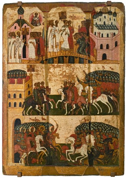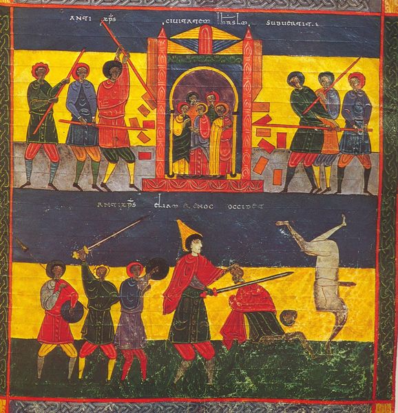 Facundus created this illustration around 1050, using ink and colors to depict a scene inspired by the Apocalypse. The composition, arranged in three distinct registers, draws us in with its vivid colors and bold outlines. The beast, rendered in striking red, dominates the upper register, immediately evoking a sense of impending doom. Here, the use of color and form transcends mere representation, diving into the symbolic. The registers could represent different spiritual and terrestrial realms or stages in an apocalyptic narrative. The geometric shapes, the figures, and the landscape each have a coded significance, reflecting a structured vision of the cosmos and human destiny. Notice how the rigid lines and symmetrical layout create a sense of order, even within a scene of chaos. This work can be viewed not just as an image but also as a complex semiotic system that invites us to unravel the cultural and philosophical underpinnings of its time.