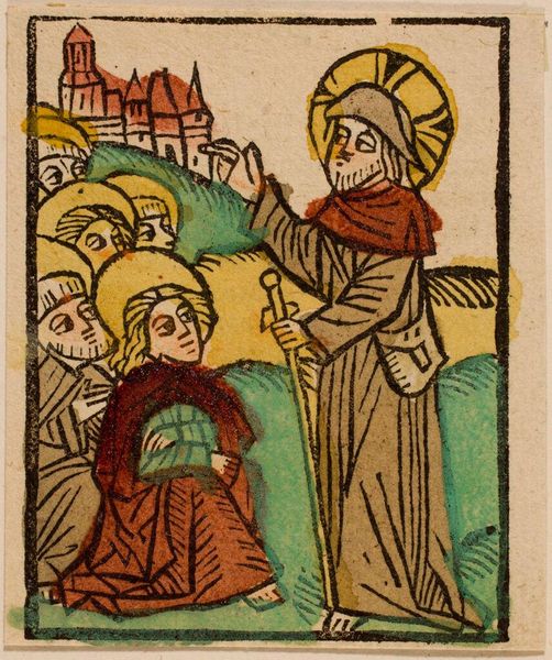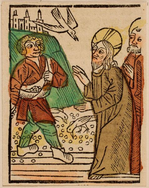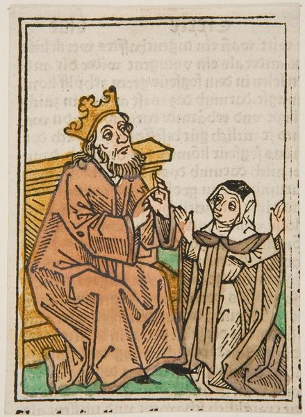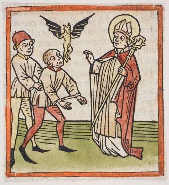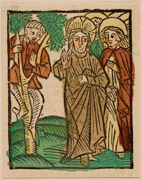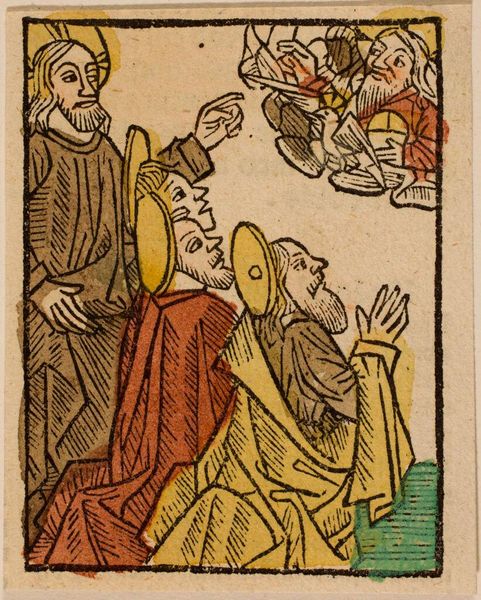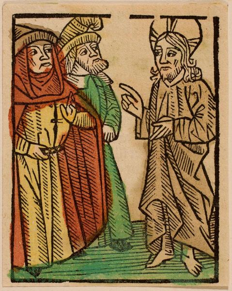 Curator: This is "Illustration V", an anonymous work held at the Harvard Art Museums. The print depicts a scene with three figures. Editor: It has a stark, almost unsettling quality, doesn't it? The limited color palette and rigid lines amplify a sense of medieval severity. Curator: Indeed. Consider the materials and the probable woodcut process. Each impression would have been relatively uniform, suggesting a certain level of mass production and distribution. Editor: The artist’s formal choices direct our gaze, though. The man on the right gestures expressively with his hand, and the lines create the illusion of movement. Curator: I am more intrigued by the social function this image served. Was it didactic, a form of popular entertainment, or perhaps something else entirely? Editor: Ultimately, it is in the interplay of form and content that this small piece transcends its utilitarian origins. Curator: A fascinating glimpse into the intersection of belief, craft, and early image culture. Editor: It makes you wonder about the hands through which this passed!