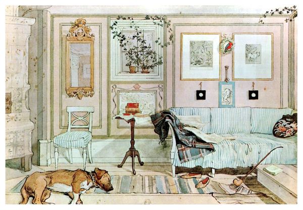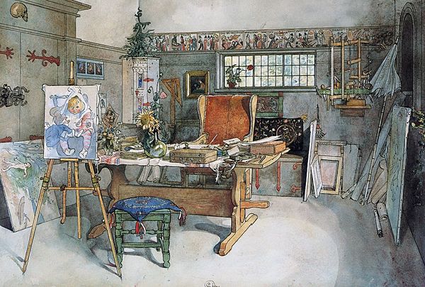 Carl Larsson created "In the Corner" using watercolor, a medium that lends itself well to capturing intimate domestic scenes. The composition, with its receding lines and central focus, invites us into a quiet, contemplative space. A young boy sits still, positioned precisely at the intersection of vertical and horizontal elements. Larsson’s use of symmetry is notable. Symmetrical arrangements of chairs, pictures, and wall decorations create a balanced yet subtly unsettling effect. The patterned rug directs the viewer's gaze toward the heart of the room, but it's the boy's placement that truly anchors the scene. The patterned stove adds a vertical complexity, balancing the formality of the architectural space. Through this structured interplay of domestic objects, Larsson prompts us to reflect on how our surroundings shape our emotional states. The painting destabilizes the traditional notion of domestic bliss, suggesting that even within the comfort of home, there can be moments of isolation. The formal elements of symmetry and perspective thus transcend mere aesthetics, engaging us in a broader discourse on human experience and the psychology of space.
