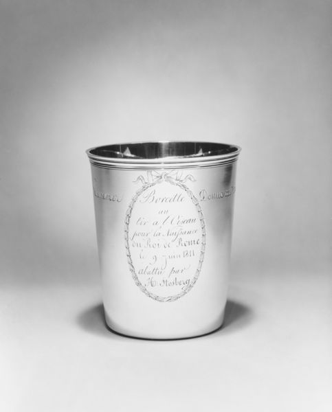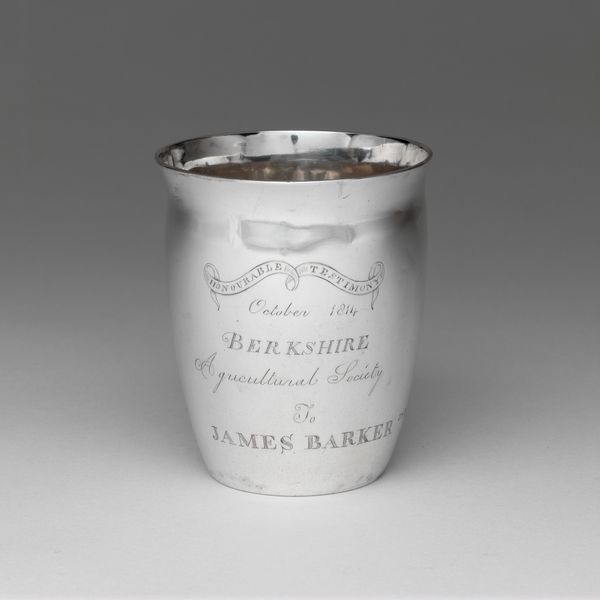 Curator: The elegant, muted sheen of this "Beaker" immediately captures the eye. It was crafted between 1800 and 1830 and currently resides at the Metropolitan Museum of Art. Its smooth surfaces, made from silver and other metals, show careful craftsmanship. Editor: I see simplicity. Its plain design has an old and quiet kind of dignity. It suggests reflection. What stories could this cup tell? Curator: Consider how the craftsman emphasizes its simple form, an exercise in minimalism. There are, however, subtle but calculated deviations in its otherwise straightforward cylinder. Look at the concave shaping and rounded lip. It seems deceptively plain but demands close inspection. Editor: Absolutely. And that engraving—the inscription serves to further enhance it as more than a simple vessel. Isaac D. Verplanck Wilcocks...the piece feels incredibly personal. I see family lineage, perhaps a precious heirloom. Curator: Indeed. Inscribed names often act as important clues. Do you notice that the name on it looks old, hinting that the beaker might be for special family events or remembrance? Also note how the reflective nature of the material both catches the light and makes the writing catch the viewers' eyes, too. Editor: Yes! It links the material properties of the silver to the content of the engraving. That connection is interesting and could even symbolize purity and clarity—values linked both to silver and a clear lineage. Its symbolic properties speak of both material worth and moral character, linking this cup to ideas of historical memory and self-definition within family and community. Curator: Beautifully articulated. Studying this Beaker through iconography allows a greater insight into the artist's world—revealing its conceptual depths by linking formal design to narrative content. Editor: And looking closely, we gain appreciation not just for the physical craft but the emotional connections. It becomes a silent bridge between us and an individual of the past.