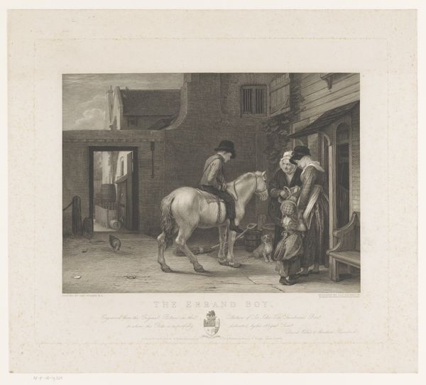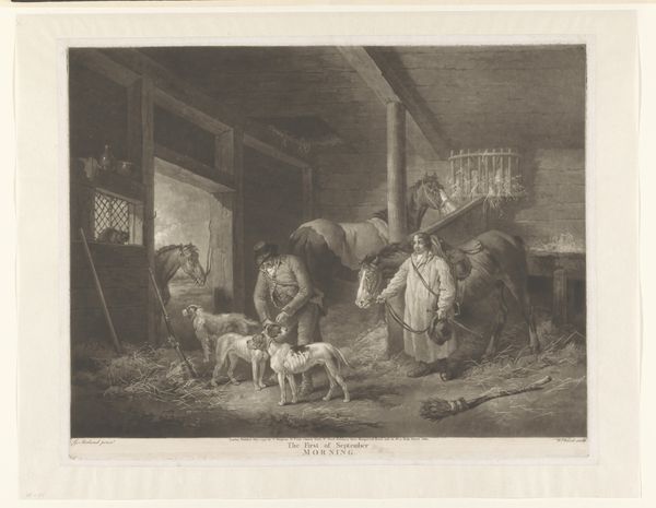Wouter Verschuur made this print of horses and dogs in a stable, using a technique that renders every detail visible. The printmaking process, likely etching or engraving, demanded meticulous labor. The artist would have used specialized tools to incise lines into a metal plate, which was then inked and pressed onto paper. Look closely, and you will see the fine web of lines that build up the image. This wasn’t just about replicating an image, but about a whole culture of skilled work. The material of the print itself – paper, ink, and metal – speaks to a world increasingly shaped by industry and trade. The ability to reproduce images, like this scene of working animals, highlights the changing relationship between humans, animals, and labor in the 19th century. The value lies not only in the final image but also in the process itself.