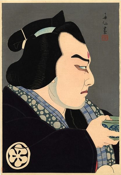 Natori Shunsen created this print of Kitaoka Nizaemon as Wakasanosuke, a character from the famous Chushingura story. Shunsen elevates the Kabuki actor to the level of art, by focusing on his unique features, and inviting the viewer to appreciate the actor’s craft. The actor is shown here in his role as Wakasanosuke, one of the romantic leads from the famous play Chushingura, which tells the story of a group of samurai who avenge their lord's death. This play gained prominence during the Edo period, when the samurai class was looking for ways to prove its relevance in society. The artist uses the actor's powdered face to draw attention to his expression, and to emphasize his identity. The actor seems to be in deep contemplation, perhaps reflecting on the complex social dynamics of the play, which revolve around revenge and the complexities of loyalty. Shunsen's print captures the emotional depth and the cultural significance of Kabuki theater.