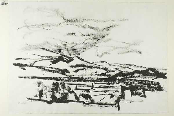 This untitled work is a drawing by George Bunker, created on February 25, 1973. At first glance, what stands out is the composition, a landscape articulated with dynamic lines, mainly in black and white. The charcoal strokes create a play of light and shadow that suggest depth and volume. Bunker's approach reflects a deep engagement with form, using the materiality of charcoal to create a sense of immediacy. The sketch-like quality, particularly in the foreground, invites us to consider the semiotics of mark-making. The contrast between the densely worked areas and the blank space destabilizes the traditional figure-ground relationship, challenging our perception. The strategic use of hatching and cross-hatching builds areas of shadow, giving the landscape a three-dimensional presence that belies the flatness of the page. This visual strategy functions beyond mere representation; it embodies a discourse on seeing, interpreting, and the very act of artistic creation. Ultimately, the drawing embodies a space for ongoing interpretation.