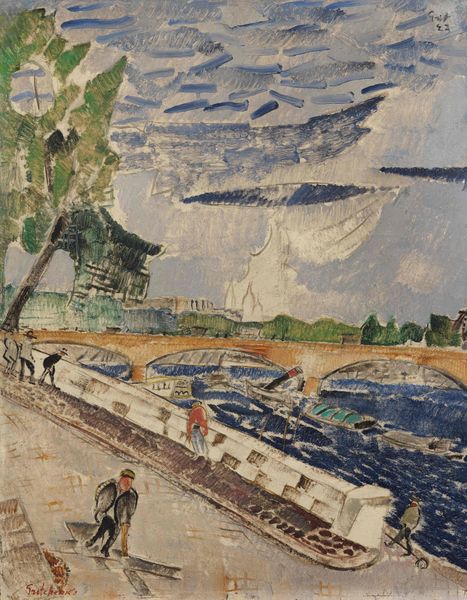Editor: Pierre Bonnard's "Pont de la Concorde," held at the Tate, uses muted tones to depict a Parisian scene. It almost feels like the paint itself is trying to capture the overcast day. What's your perspective on this work? Curator: The handling of the oil paint is indeed central. Notice how Bonnard applies it, creating a tactile surface that mirrors the working-class garments and the urban environment. The visible brushstrokes emphasize the labor and materiality of both art and everyday life, blurring the lines between them. It’s a conscious engagement with the means of production. Editor: That's an interesting point. It makes me see the painting as less of a scene, and more of an object. Curator: Precisely! Bonnard draws our attention to the physical reality of the painting itself. Thinking about the economic realities surrounding art creation changes how we perceive it.