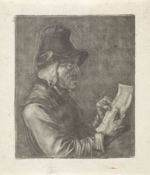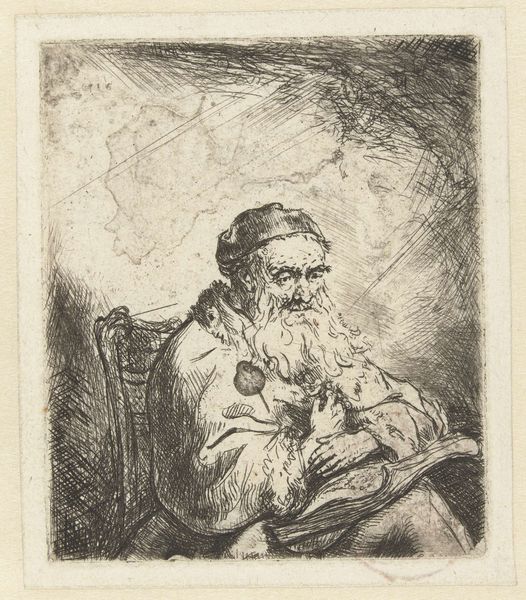 Curator: This is "Boer stopt zijn pijp (variant B)," an etching by Jan van der Bruggen, dating roughly between 1659 and 1740. What strikes you most about it? Editor: Well, immediately, it's the faces. They're so detailed, almost grotesque, but fascinating. The light catches the elder's nose in this almost comical way. He's fiddling with his pipe, there’s such intent concentration, you know? Makes me wonder what he’s thinking about while his friend watches closely. Curator: Genre scenes like this were popular, offering glimpses into everyday life, particularly of the lower classes. There’s a social commentary woven into the choice to depict these people, their habits and what might be thought of as ‘roughness.’ It raises questions about who has the right to be seen and how. Editor: Right, right, but I also see it as a moment. Just a simple human interaction, despite any social implications. The other guy's kind of grinning, he seems to enjoy it somehow. There’s warmth in sharing a smoke. The shading contributes, adding like depth to their companionship. Curator: The etching technique allowed for the mass production of images, making them accessible to a wider audience. So it's not just about depicting them, but also circulating these representations. These prints could reinforce or challenge social norms and perceptions. Consider how class differences become spectacles for the emerging middle class who bought them to display. Editor: Hmmm, I guess my approach to art has less to do with history, and more to do with… well, the current emotional context? It feels so universal in its mundaneness. That pull towards connection, the little joys. Forget social critique for a moment—haven't we all looked at a friend doing something ordinary and just...been content? Curator: That resonance, though filtered through time, also reflects how genre paintings could become stages where we performed roles associated with cultural life. They're images we keep, like photographs, and turn them into evidence. Editor: Exactly. So, regardless of intention, this one made it! It gives that beautiful window into history but remains human. Curator: Well said. The layering of these historical images helps contextualize the past as evidence and feeling. Editor: Indeed. There are far more insights contained in those smudgy black lines of Bruggen than I had expected.