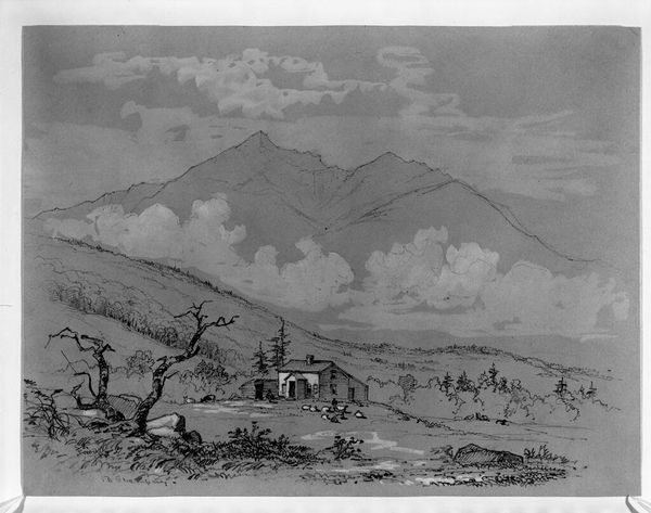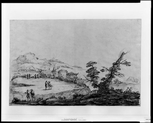 Editor: This is Thomas Gainsborough's "Wooded Upland Landscape with Mounted Figures and Cottage." It's undated, but the drawing utilizes chalk and gray wash. It’s quite small, almost intimate. What strikes me is the way the landscape seems to dwarf the figures. How do you approach a piece like this? Curator: We should examine the labor that produced this image. How did the availability and cost of chalk and paper in 18th-century England affect Gainsborough’s artistic choices? Consider the social context of landscape art at the time; how does it relate to land ownership and the lives of the rural working class? Editor: That’s a perspective I hadn’t considered. So, you’re suggesting the materials themselves, and their accessibility, shaped the artwork’s meaning? Curator: Precisely. The means of production always influence the final product, and the social standing of the artist. Thinking about those things gives us insight into the world in which Gainsborough was working. Editor: I’ll definitely look at art through that lens from now on.