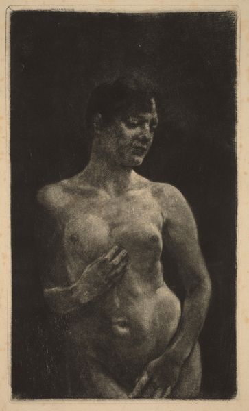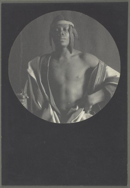 Curator: This gelatin silver print, "Life's Cycle" from around 1926 by Henry Sill, offers a powerful visual statement. What strikes you first? Editor: The stark geometry overlaid with such vulnerable humanity creates a somber tone; the palette contributes, creating an almost overwhelming feeling of melancholy. Curator: I find myself immediately drawn to the visual language. The circle—that stark, patterned disc—resonates universally as a symbol for cycles, continuity, even fate itself. Consider the pose of the figure nestled against it. Is this a depiction of resignation, or perhaps comfort within an unending loop? Editor: I am thinking more along the lines of tension and balance. Note how the organic, flowing form of the figure presses up against the sharp, unyielding shapes within that perfect geometric construction. This relationship dictates much of the image's narrative and is amplified by tonal variations of silvery light and shadow. Curator: It's the art deco influence on that geometric circle, I think, that steers my thinking. This period embraced clean lines and ordered forms to symbolize progress and control, yet here, the vulnerable nude figure seems weighed down. A stark commentary, maybe, on modernism's promises. Editor: Agreed. There's definitely a compelling paradox there. The Art Deco elements feel deliberate—a stark contrast against the soft, yielding flesh, amplifying the overall tension, but in his careful treatment of tone, Sill unites them—or perhaps even neutralizes them? Curator: Consider also that he presents the human form stripped bare. Absent of artifice. Placed so intimately within a geometrical container. I wonder, did Sill mean to symbolize our vulnerability as we circle through repeating patterns? Do we become passive agents guided by our own internal geometries? Editor: Whether Sill consciously intended all of that symbolism is another question, but his careful orchestration of light and form ensures this work is powerfully emotive, inviting continuous observation of all the tonal, textural and abstract possibilities that a single artistic choice provides. Curator: Yes. "Life's Cycle" manages to resonate through its manipulation of symbolic weight and personal vulnerability, capturing anxieties within modernism’s rigid, aesthetic ideals. It prompts us to question who is master, the body or the form around it? Editor: A great success in capturing the very mood that speaks of modern life through contrasts alone, in my opinion.