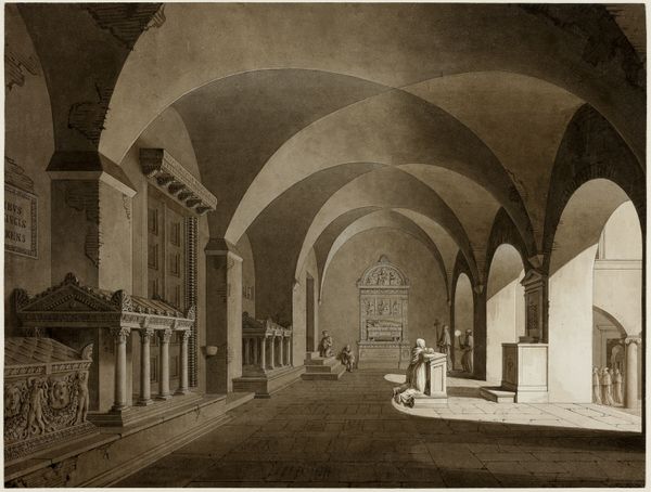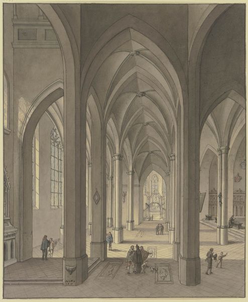 Georg Hoffmann created this image of the interior of Karrebæk Kirke using etching techniques. The drawing, with its rigid lines and perspective, presents a structured view into the church's nave. The composition is dominated by the architectural framework: pointed arches, ribbed vaults, and the linear arrangement of pews, all receding towards the altar. The figures are secondary to the architecture. Hoffmann's image can be interpreted through the lens of structuralism. The church itself represents a structure of meaning, reinforced by the ordering of space and the alignment of its elements. The arches create a semiotic echo that destabilizes fixed meanings, and instead, it invites us to explore how these architectural signs establish cultural and religious values. The artwork invites ongoing interpretation where its formal qualities function as part of a cultural and philosophical discourse.
