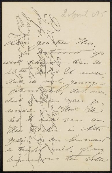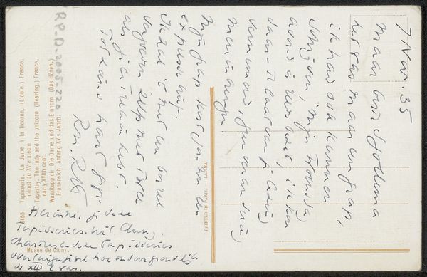Curator: This is a fascinating piece from the Rijksmuseum collection, "Briefkaart aan Ab Bogtman" – that's "Postcard to Ab Bogtman," dating from before 1938. It is an ink drawing with photography on paper by Richard Nicolaüs Roland Holst. Editor: Immediately, I am struck by the elegant, looping script. It possesses an almost rhythmic quality, flowing across the aged surface of the paper. It has a lovely warmth in tonality due to the aged surface tone and density. Curator: Indeed. Holst, a prominent figure in Dutch symbolism and socialism, often utilized his artistic skills for social commentary. His design aesthetic grew during this period of national struggle. This postcard exemplifies that engagement through a personal message, most likely in support of a loved one's work and cause. Editor: The calligraphic hand adds a dimension beyond mere utility, it transcends casual communication through these looping forms and almost uniform weight of the linework. One almost feels compelled to discern the artist's mood simply by viewing this element of the postcard. Curator: Considering its socio-political role provides additional insight. As a member of a socialist society that strongly felt the changing and stressful political situations leading up to the second world war, this style reflects the need to offer messages in carefully constructed yet somewhat cryptic styles in the interest of the security of his community. Editor: That context greatly informs our understanding! I originally focused on the letterform as isolated shapes and their careful arrangement within the compositional space but with the context of secure or coded message exchange I recognize there is more to understand within. The almost musical nature is no longer an accidental output of good style but potentially deliberate communication design. Curator: Precisely, its beauty lies not just in its visual aesthetics but in its intersection with the historical undercurrents. As a result, this tiny token contains a fascinating social narrative for its period. Editor: Absolutely. Initially the linework presented almost pure emotion, yet contextualized by political action and necessity that linework also creates boundaries and structures and restrictions of expression which only enhances the beauty here.