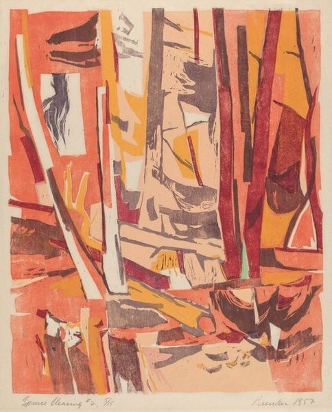 Curator: This untitled piece by Albert Urban, created in 1944, presents an intriguing combination of printmaking and mixed-media techniques. What strikes you most about it? Editor: Immediately, I'm drawn to its ambiguous figuration. It feels almost dreamlike, perhaps reflecting the anxieties and uncertainties of the wartime era, with simplified figures appearing displaced within the landscape. Curator: Precisely. If we consider the material qualities, you see the process of layering inks which, coupled with the stark geometric forms, generates an unexpected tension. It is neither strictly abstract nor entirely representational. Notice how the color palette - the muted browns, grays and olives- works to both define and flatten the space. Editor: I wonder how the materials available during the war might have shaped his aesthetic choices? The limited palette may point to resource scarcity, impacting not just aesthetics but artistic possibilities broadly. It may speak about a specific identity in this place and period. Curator: Good point! It encourages us to think about constraints that fostered unique ingenuity. You see that there's an active conversation about what counts as elevated art versus working-class craft production with such an approach to image-making. Editor: The very notion of "Untitled" also invites consideration: is it withholding specificity a conscious resistance to readily consumable narratives within a volatile moment? Or is that to attribute too much intentionality to a work from that time? Curator: The lack of title certainly keeps the reading open, acknowledging possible personal stories embedded in abstract design and color field. It invites varied reflections on modern social circumstances and existential conditions. Editor: Perhaps we could propose it captures feelings of uncertainty about life and the future for so many during the conflict, yet retains quiet optimism for hope in rebuilding society through collective action afterward. Curator: Ultimately it is those very tensions in media and intention, as much as whatever symbolic value that interests, provoking engagement about our own sense of history being both a collective making and individually lived and felt experience. Editor: Indeed, considering the artwork in its historical frame can really reshape the reception process.