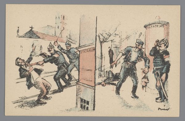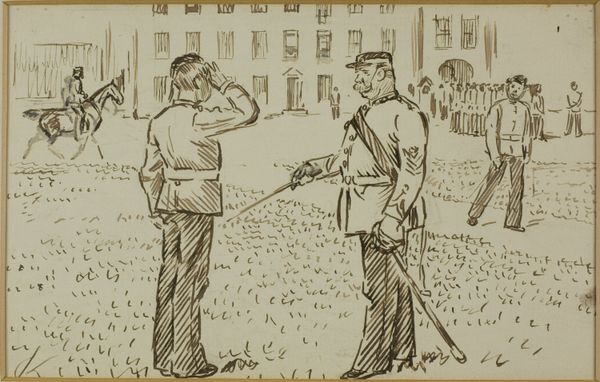 Curator: Well, this small lithograph, simply titled "Upset His Coffee," presents an interesting camp scene, probably dating from the late 19th century. Editor: It's humorous, isn't it? And just a touch cruel, with the seated soldier’s horrified expression as the coffee spills. The tipped-over pot itself becomes a potent symbol of disruption. Curator: Indeed. The act, seemingly insignificant, carries a weight, unsettling the daily rituals. I wonder about the broader cultural implications: the casual disregard for a simple pleasure. Editor: Or perhaps it speaks to the tensions and boredom of camp life, played out in petty grievances and practical jokes. Coffee, then, as a stand-in for normalcy, easily shattered. Curator: Certainly, coffee held considerable cultural importance. It would be interesting to see how this image circulated and the meanings it acquired in different contexts. Editor: Food for thought—or should I say, coffee for thought! I appreciate how this small image sparks such a wide-ranging discussion. Curator: Me too; these everyday moments tell a rich story.